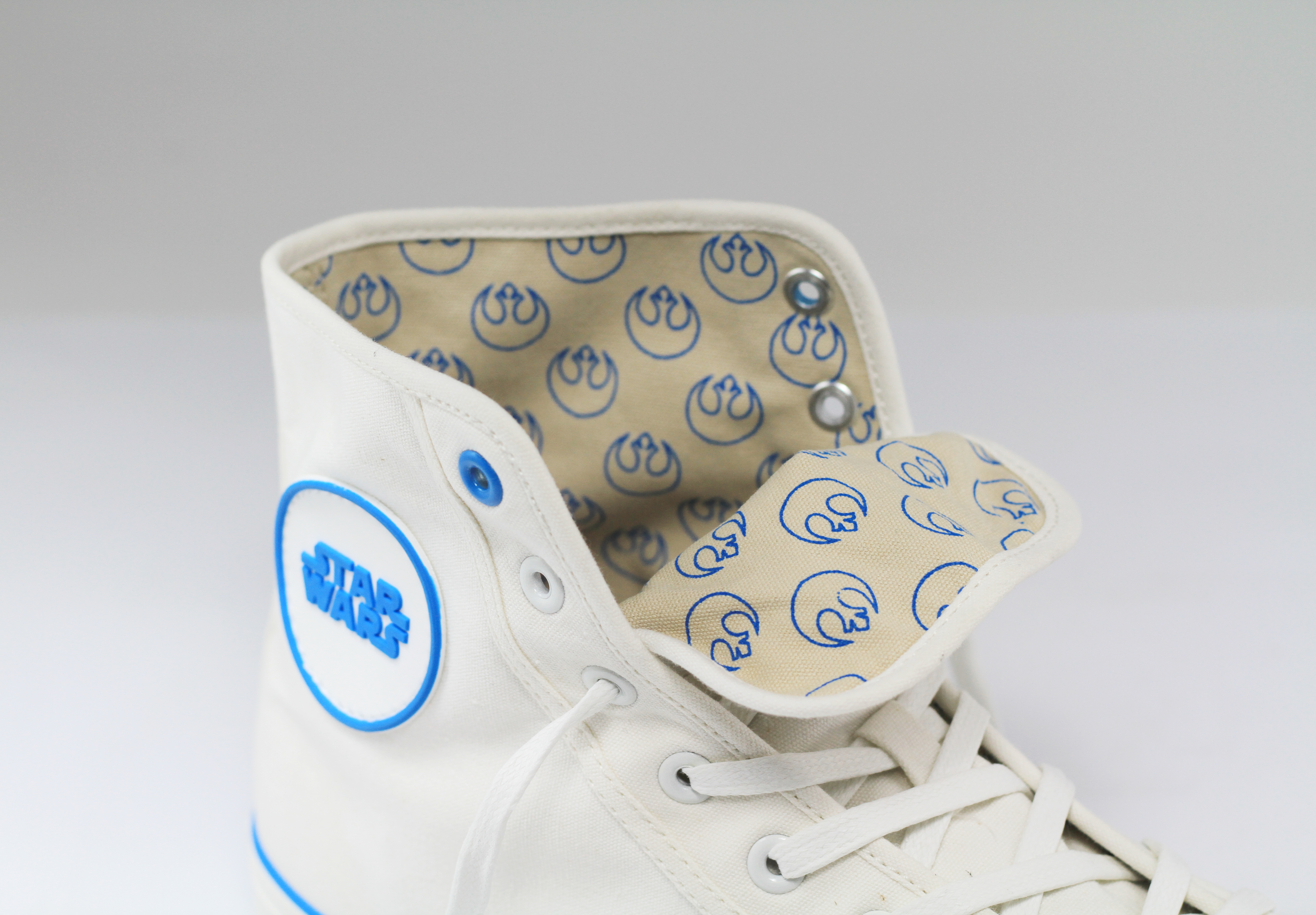 Originally created in 1964 to outfit the Baltimore Bullets basketball team, this special edition version features a black or white/blue 'Star Wars' rubber patch on the side of the shoe.